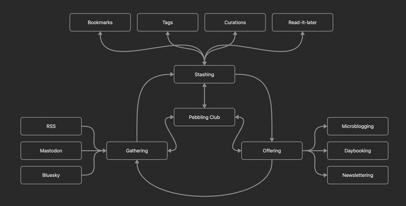 That is, a thing I've really liked doing on the internet is finding things in feeds, gathering & stashing them, then sharing them back out in hopefully interesting ways for fascinating folks. Routing shiny pebbles to potential friends on the web. Occasionally, I'll make & share something original, but being a human repeater feels fun to me.